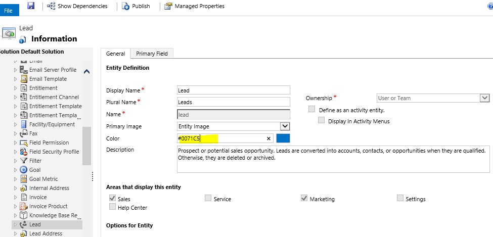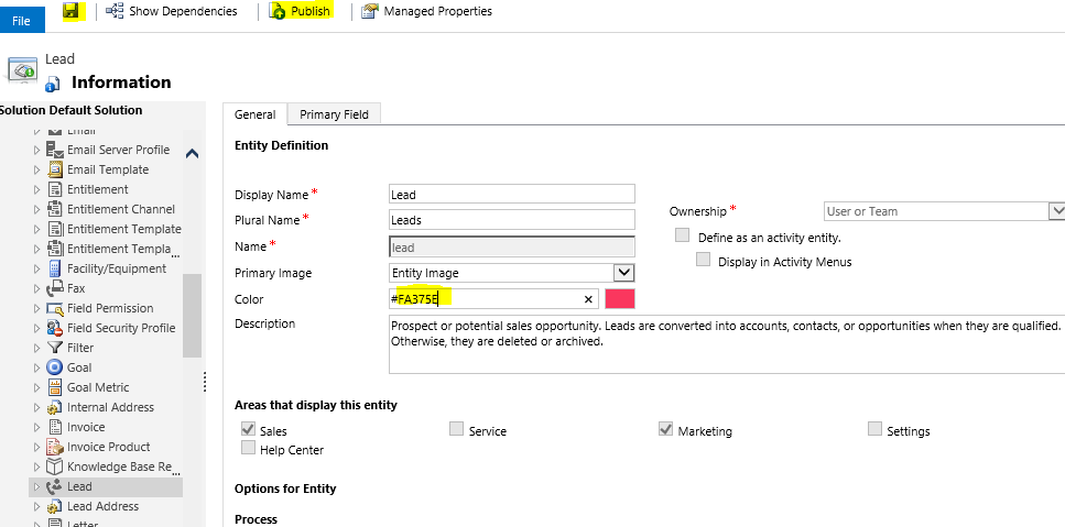 After the release of UR1 of MS CRM 2015 I found a strange yet useful feature. On entity configuration page there is an attribute called ‘color’. This is not yet officially mentioned anywhere in the UR1 related documents but the Good News is, its there