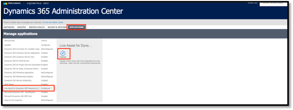 Go to D365 Admin Centre>>Applications>>Live Assist>>Manage