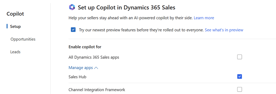 Sales Hub >> App settings (Area) >> General Settings>> Copilot>> Setup