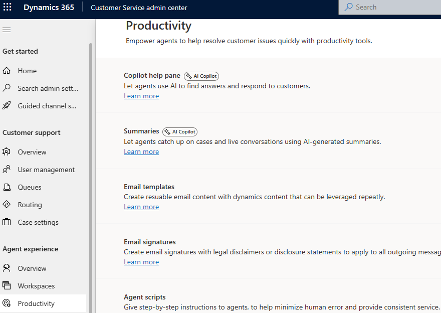 | Dynamics 365 Customer Service Enterprise with customer service add-in (for chat response and conversation summary) | N/A | |