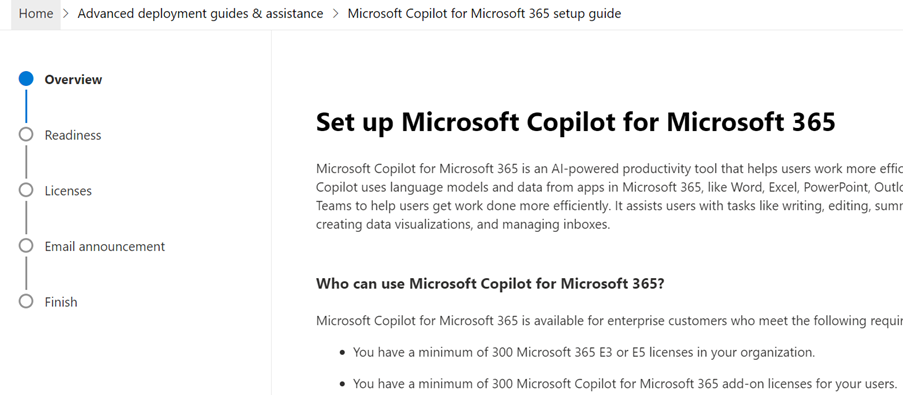 - Go to https://admin.microsoft.com/Adminportal/Home?Q=learndocs#/modernonboarding/microsoft365copilotsetupguide